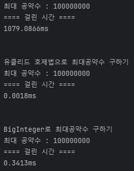 실행 결과 약수 탐색으로 최대공약수를 구했을 땐 1079ms가 걸렸지만 유클리드 호제법을 구현한 방법과 BIgInteger 2가지 방법은 0ms가 걸렸다. BigInteger 방식이 실행되는 조건과 메소드가 직접 구현한 방법보다 많기 때문에 시간이 약 180배 더 걸렸지만 그래도 알고리즘 문제 대부분의 제한 시간인 1초 이내로 실행 된것을 알 수 있다.